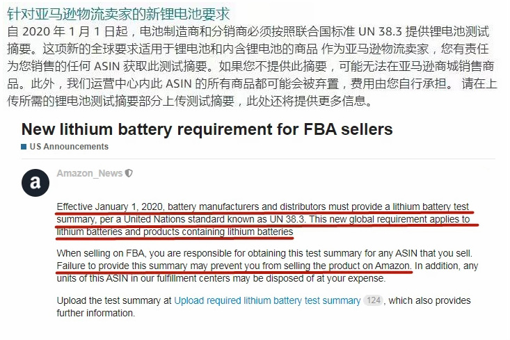 近日,各亞馬遜電商陸續(xù)收到了官方通知,要求自2020年1月1日起,電池制造商和經(jīng)銷商必須根據(jù)聯(lián)合國標(biāo)準(zhǔn)UN38.3提供鋰電池測試摘要,這一新的全球要求適用于所有的鋰電池和含鋰電池的產(chǎn)品。 該規(guī)定雖然是亞馬遜對FBA配送的賣家發(fā)出的通知,但根據(jù)該規(guī)定,所有出售鋰電池及包含鋰電池產(chǎn)品的賣家都必須按照UN38.3標(biāo)準(zhǔn),提供相應(yīng)的檢測摘要,并不僅僅只是使用亞馬遜FBA配送的賣家,也不僅僅只是亞馬遜賣家,而是全球出售鋰電池及包含鋰電池產(chǎn)品的所有賣家!