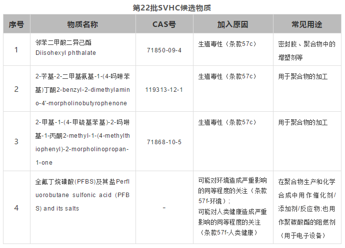 歐洲化學(xué)品管理局(ECHA)于2020年1月16日公布了新一批高關(guān)注物質(zhì),之前咨詢清單上的4項物質(zhì)全部加入了候選清單。 其中鄰苯二甲酸二異己酯、2-芐基-2-二甲基氨基-1-(4-嗎啉苯基)丁酮、2-甲基-1-(4-甲硫基苯基)-2-嗎啉基-1-丙酮由于生殖毒性,而全氟丁烷磺酸(PFBS)及其鹽由于其多種特性,被加入到SVHC候選物質(zhì)清單中。至此SVHC候選物質(zhì)清單共包括22批205種物質(zhì)。 中認(rèn)聯(lián)科提醒企業(yè)在生產(chǎn)或進(jìn)口這些物質(zhì)以及含有這些物質(zhì)的產(chǎn)品時需要根據(jù)候選清單明確它的潛在義務(wù)。