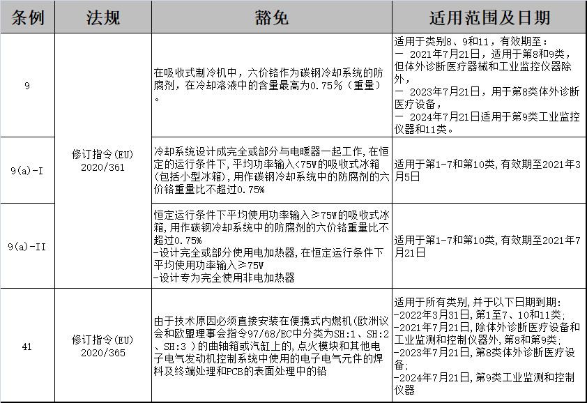 2020年3月5日,歐盟官方日志(Official Journal of the European Union)上發(fā)布了五項新指令,其中關(guān)于2011/65/EU的(表格一)修訂條款包括9,9(a)-I,9(a)-II,41;(表格二)的修訂條款為37,41,新增豁免條款44。